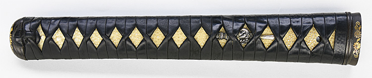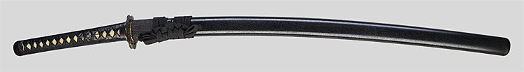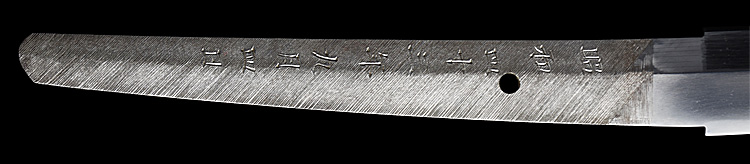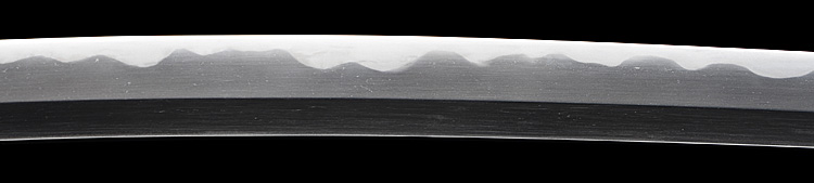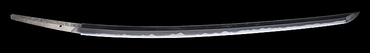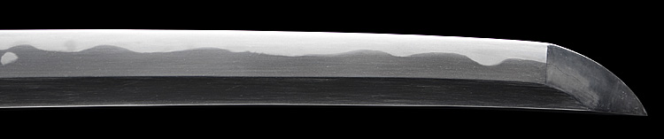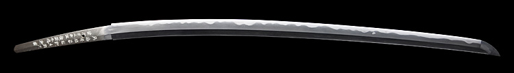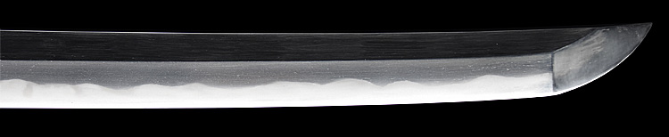 本造り庵棟 うぶ茎 小板目肌、杢交じりよく詰む。地沸微塵につき、細かな地景入り淡く沸映り立つ。刃紋は湾れに互の目、丁字、尖り刃交じる。匂い口やや深めに沸よくつく。湯走り、飛び焼かかり、足、葉よく働く。金筋、砂流しよくかかり、匂い口明るく冴える。本名は鳥生廣。父、熊太郎宗廣の門。黒呂塗鞘打刀拵付き。