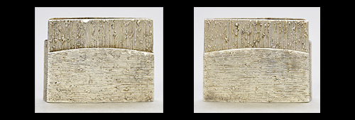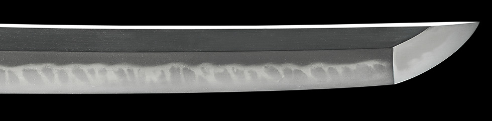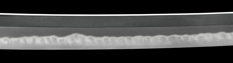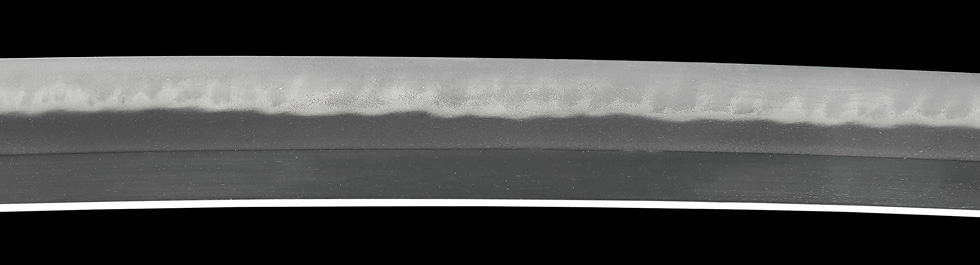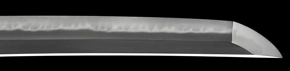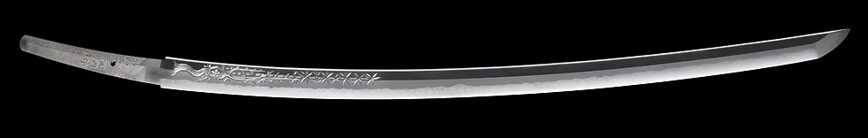本造り庵棟 うぶ茎 小板目肌、杢交じりよく詰む。地沸微塵に厚くつき、細かな地景よく入り、淡く沸映り立つ。刃紋は互の目丁字乱れ、尖り心の刃交じる。匂い口フックラと小沸よくつく。匂い足長く盛んに入り、葉よく働く。金筋、砂流し頻りにかかり、匂い口明るく見事に冴える。表に剣巻龍(独鈷付)裏に松竹梅の彫刻。本名は高橋金市。国工院名誉会員権大宗匠、号は竜王子。月山貞一、貞勝の門。上皇后美智子様のお守り刀を造る。人間国宝第一号。(特別保存刀剣)