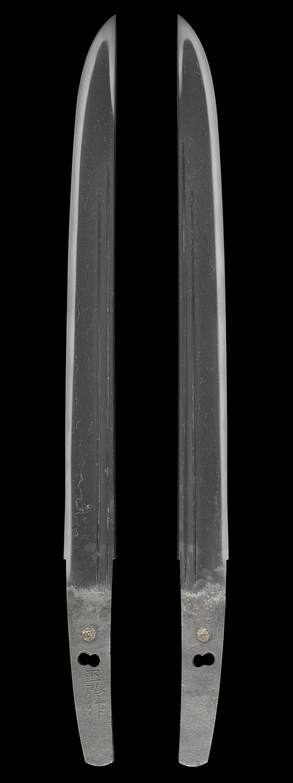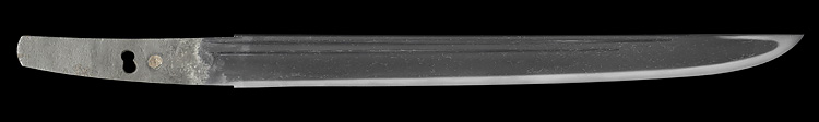 平造り庵棟 うぶ茎 板目肌、杢交じりよく練れ詰む。地沸微塵につき、細かな地景顕われ、淡く映り立つ。刃紋は中直刃浅く湾れて、小乱れ交じる。匂い口フックラと小沸よくつく。僅かに足、葉働く。金筋、砂流しかかり明るく冴える。表裏に丈くらべ樋の彫刻。備後三原派。(保存刀剣)