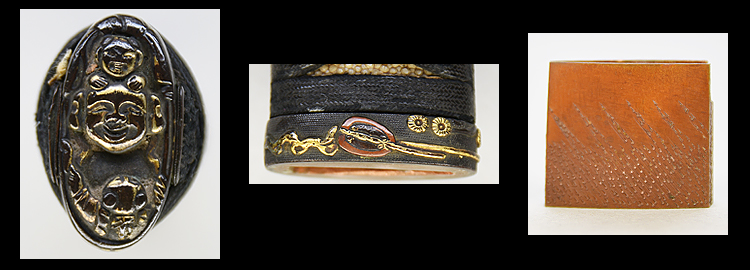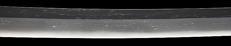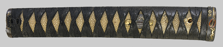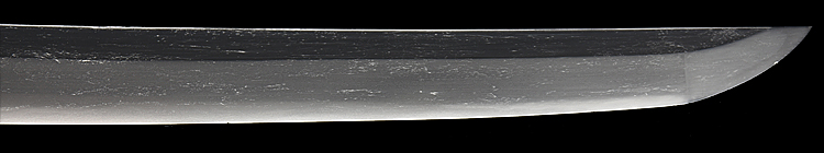 本造り庵棟 磨上茎 板目肌、柾交じりよく詰む。地沸微塵につき、細かな地景顕われ、乱れ映り立つ。刃紋は湾れに互の目、尖り刃交じる。匂い口フックラと小沸よくつく。足、葉盛んに働き、金筋、砂流し頻りにかかる。匂い口明るく冴える。南北朝期、長船鍛冶の傍流である秀光、師光、則光等の鍛冶を小反り物と呼んでいます。黒石目模様塗鞘打刀拵付き。(特別保存刀剣)