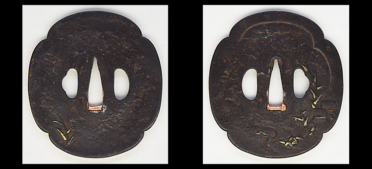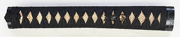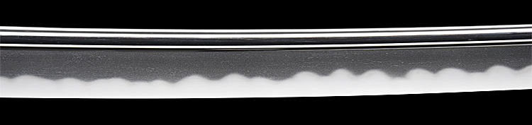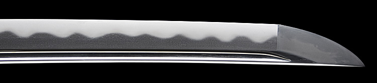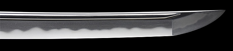 本造り庵棟 うぶ茎 小板目肌、杢交じりよく詰む。地沸微塵に厚くつき、細かな地景顕われ淡く沸映り立つ。刃紋は湾れに互の目、尖り心の刃交じる。匂い口フックラと小沸よくつく。匂い足、葉働き、金筋、砂流しよくかかる。匂い口明るく冴える。表裏に棒樋の彫刻。高橋次男。宮入昭平の門。無鑑査。黒呂塗鞘打刀拵付き。