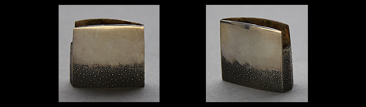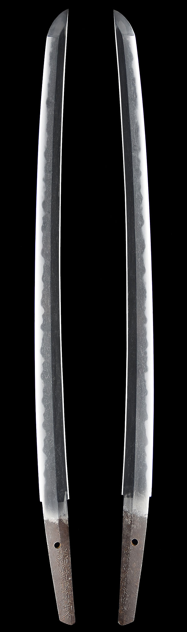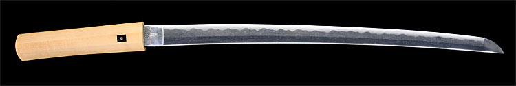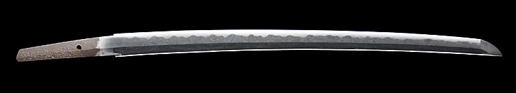 本造り庵棟 うぶ茎 小板目肌、柾交じりよく詰む。地沸微塵に厚くつき、細かな地景顕われ、白気風の映り立つ。刃紋は湾れに互の目。尖り心の刃交じる。匂い口フックラと小沸よくつく。小足、葉働き、金筋、砂流しよくかかる。匂い口明るく冴える。清水住。初代上野守寿命の子。尾張にても打つ。(特別保存刀剣)