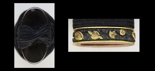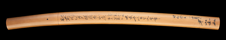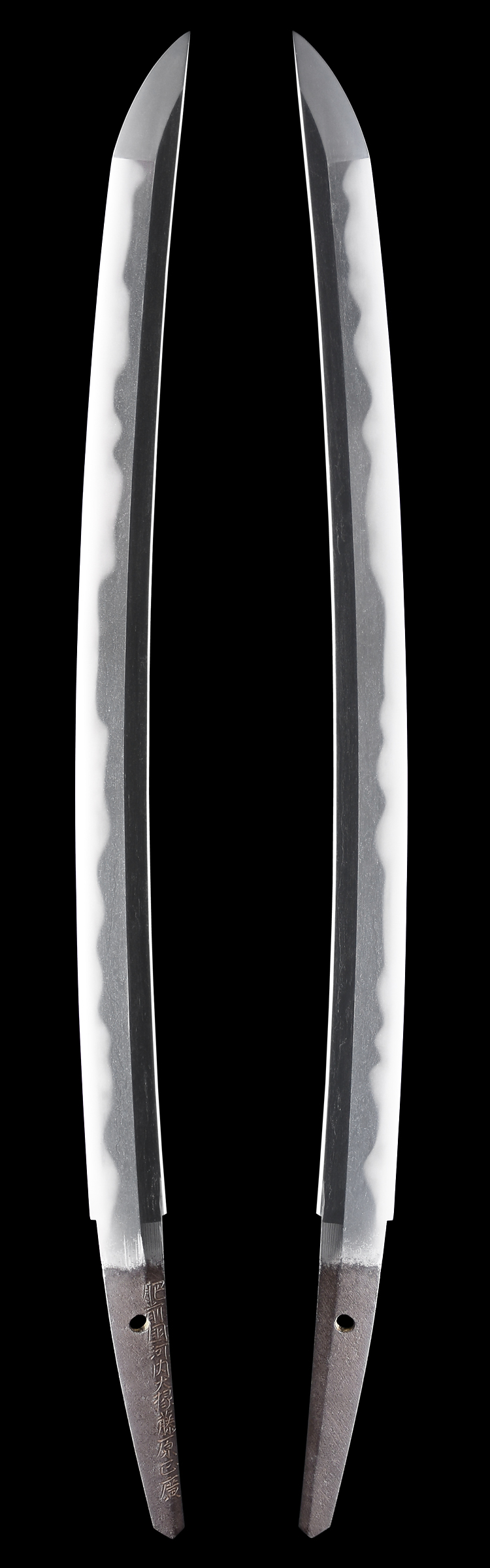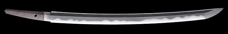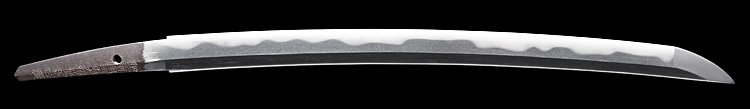 本造り庵棟 うぶ茎 小板目肌、杢交じりよく詰む。地沸微塵に厚くつき、細かな地景よく入り、淡く沸映り立つ。刃紋は湾れに大互の目、丁字、尖り心の刃交じる。匂い口深く沸、小沸よくつく。沸足、葉盛んに働き、金筋、砂流し頻りにかかる。匂い口明るくよく冴える。本名は橋本左伝次郎正永のち弥七兵衛。吉信の子。藩主鍋島勝茂の御留め鍛冶。黒呂塗鞘脇差拵付き。(特別保存刀剣)