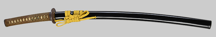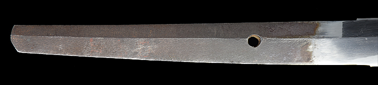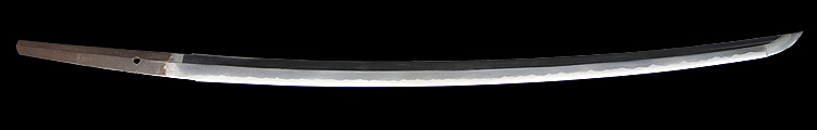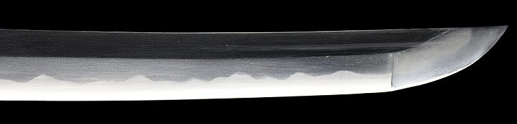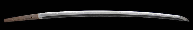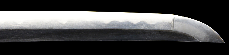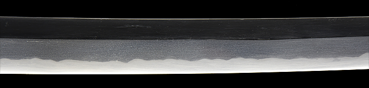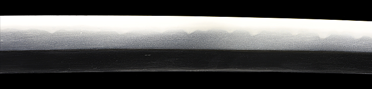 本造り庵棟 うぶ茎 小板目肌、柾交じりよく詰む。地沸つき、細かな地景顕われ、白気映り立つ。刃紋は尖り互の目、三本杉風に乱れる。匂い口ややフックラと小沸よくつく。僅かに小足、葉働き、金筋、砂流しかかり、明るく冴える。本名は酒井勝利。関の軍刀鍛冶、戦後の作刀を見ない。黒呂塗鞘打刀拵入り。