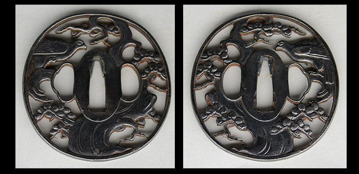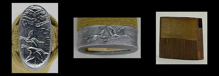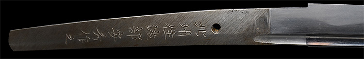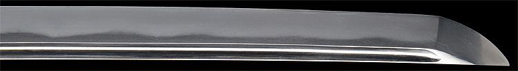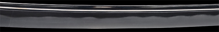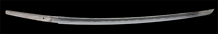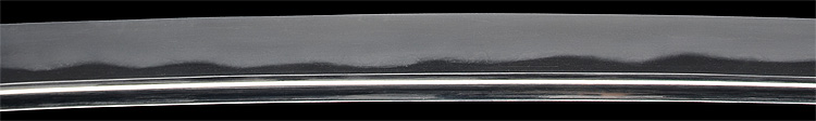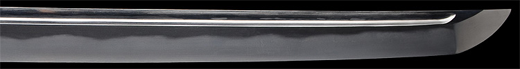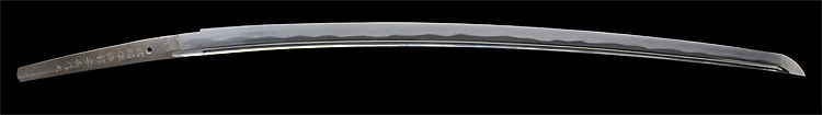 本造り庵棟、うぶ茎 小板目肌、柾交じり詰む。地沸微塵につき、地景入り沸映り立つ。刃紋は湾れに互の目、喰い違い刃交じり、飛び焼きかかる。匂いやや深めに沸づく。湯走りかかり足入り、葉働く。刃縁に金筋頻りにかかり、砂流しかかり明るく冴える。表裏に棒樋の彫刻。渡部工。堀井俊秀の門。黒呂塗鞘打刀拵入り。(1090g)