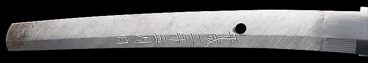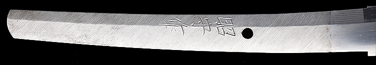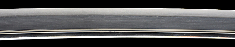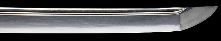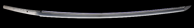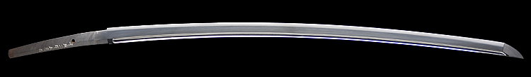 本造り庵棟 うぶ茎 小板目肌、柾交じりよく詰む。地沸つき、細かな地景顕われ、淡く白気映り立つ。刃紋は中直刃浅く湾れて小乱れ交じる。匂い口締まり心に小沸よくつく。刃縁ほつれ、湯走り、喰い違い刃かかる。僅かに小足、葉働く。金筋、砂流しかかり、明るく冴える。表裏に棒樋の彫刻。本名は宮城真一。栗原彦三郎昭秀、宮城守国の門。黒塗鞘打刀拵入り。(910g)