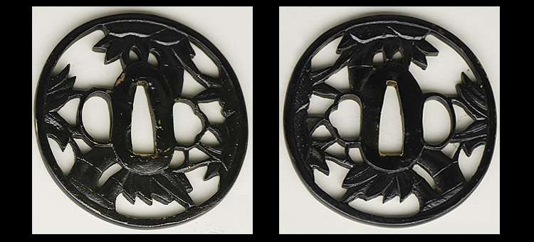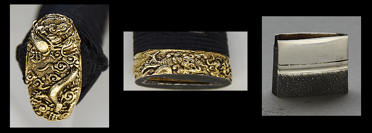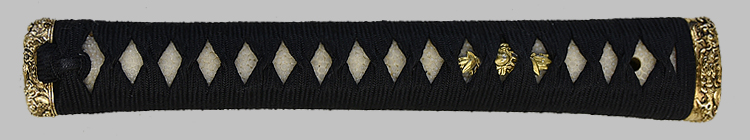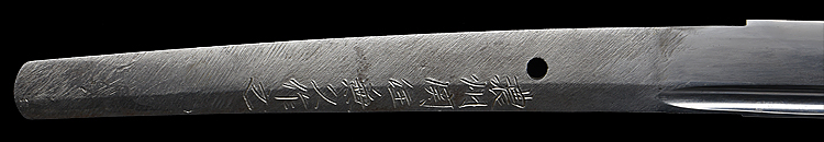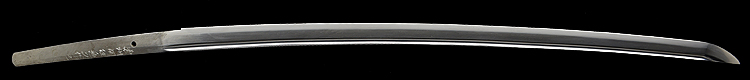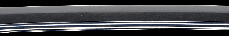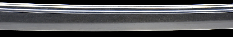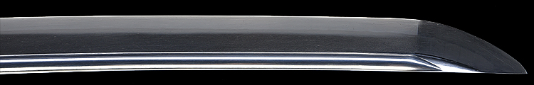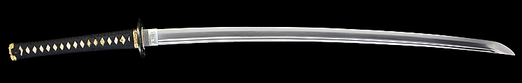 本造り庵棟 うぶ茎 小板目肌、柾交じりよく詰む。地沸つく。細かな地景顕われ、白気映り立つ。刃紋は中直刃、浅く湾れて小乱れ交じる。匂い口締まり心に小沸よくつく。小足、沸足、盛んに入り、葉よく働く。刃中にぎやか。金筋、砂流しかかり明るく冴える。表裏に棒樋の彫刻。本名は吉田研。前銘正明(二代)父初代正明の門。黒呂塗鞘打刀拵入り。(940g)