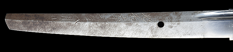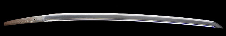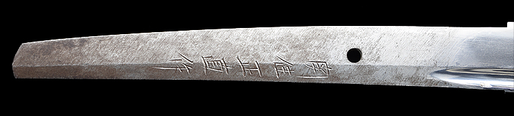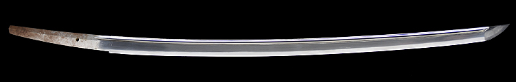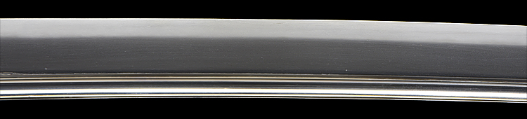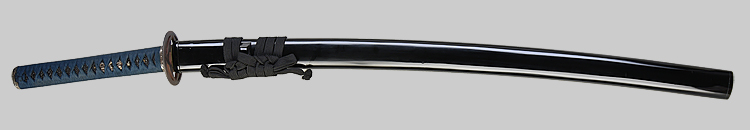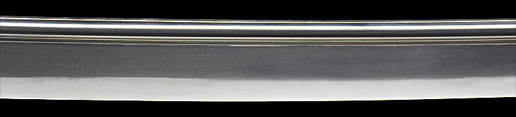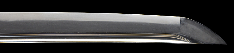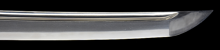 本造り庵棟 うぶ茎 小板目肌、柾交じりよく詰む。地沸つき、細かな地景顕われ淡く白気映り立つ。刃紋は互の目乱れ、丁字、小丁字、尖り刃交じる。匂い深めに沸、小沸よくつく。小足、葉盛んに働く。金筋、砂流し頻りにかかり、明るく冴える。表裏に棒樋の彫刻。本名は中田勝郎。関兼秀の子。黒呂塗鞘打刀拵入り。(1010g)
