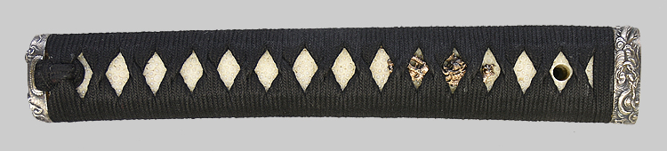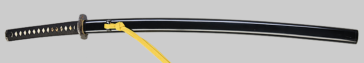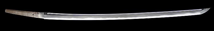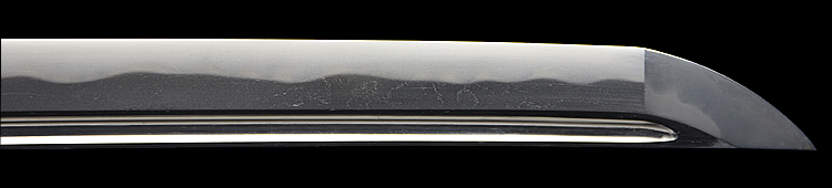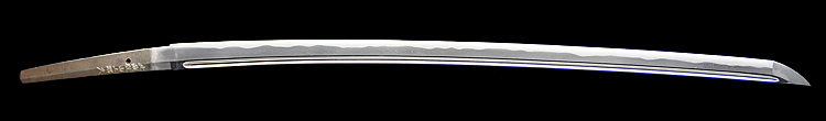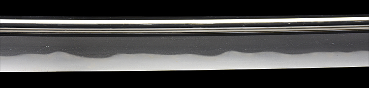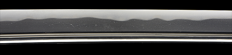本造り庵棟 うぶ茎 板目肌、杢交じりよく詰む。地沸微塵につき、細かな地景顕われ淡く沸映り立つ。刃紋は湾れに互の目、丁字、尖り心の刃交じる。匂い口フックラと小沸よくつく。小足、葉盛んに働き、金筋、砂流しかかる。匂い口明るく冴える。表裏に棒樋の彫刻。山上千里昭久。本名は山上重次。笠間一貫斉繁継の門。元陸軍受命刀匠。陸軍軍刀技術奨励会会長賞。黒呂塗鞘打刀拵入り。(1110g)