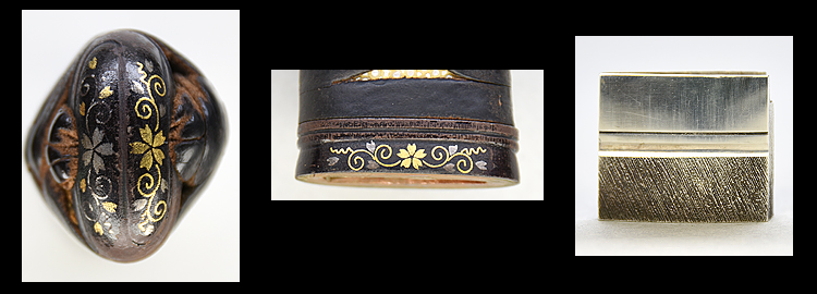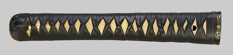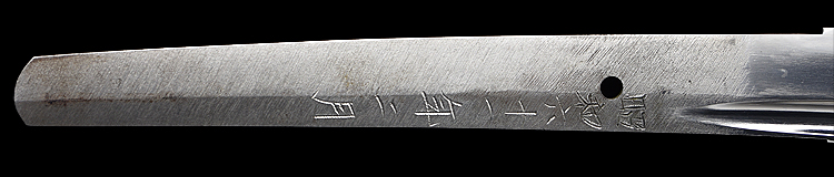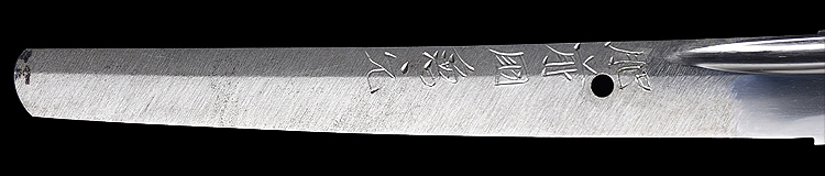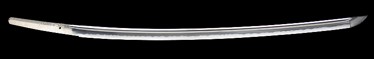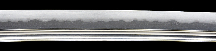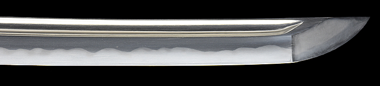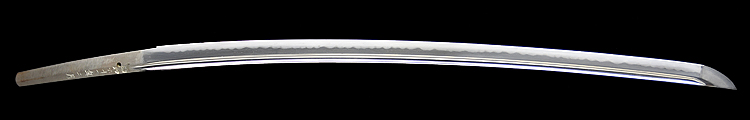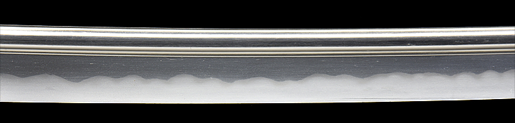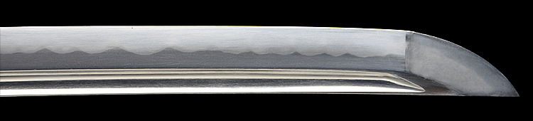 本造り庵棟 うぶ茎 小板目肌、柾交じりよく詰む。地沸微塵につき、細かな地景顕われ、淡く映り立つ。刃紋は互の目丁字乱れ、尖り心の刃交じる。匂い口ややフックラと小沸よくつく。匂い足、葉よく働き、金筋、砂流しかかる。匂い口明るく冴える。表裏に棒樋の彫刻。本名は元村兼作。三代武藤久広の門。元陸軍受命刀匠。陸軍軍刀技術奨励会総裁賞。黒呂塗鞘打刀拵入り。(920g)