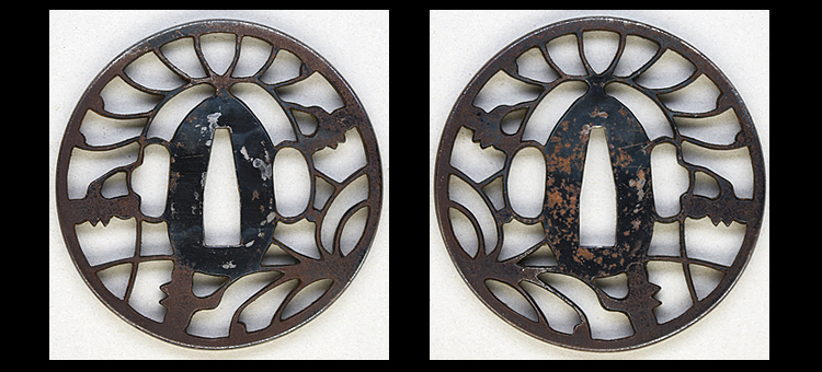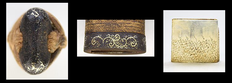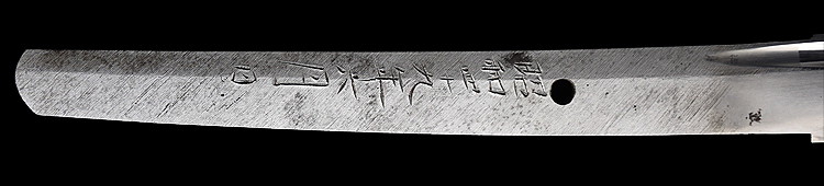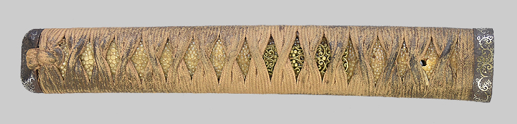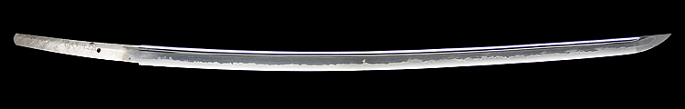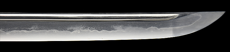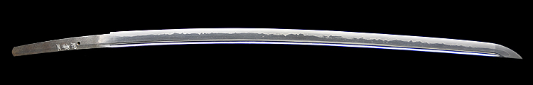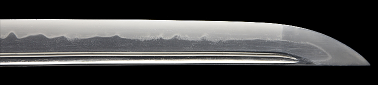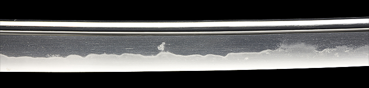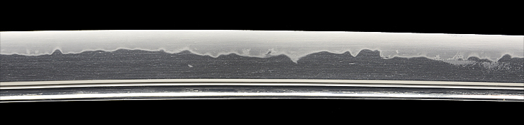 本造り庵棟 うぶ茎 小板目肌、柾交じりよく詰む。地沸微塵につき、細かな地景顕われ淡く乱れ風の映り立つ。刃紋は湾れに互の目、小丁字、尖り刃交じる。匂い口締まり心に小沸よくつく。匂い足、葉盛んに働き、金筋、砂流しかかる。匂い口明るく冴える。黒呂塗鞘打刀拵入り。(950g)