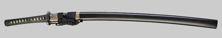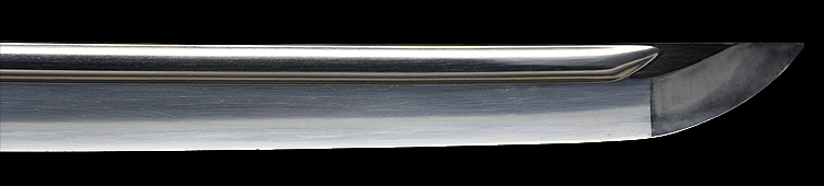 本造り庵棟 うぶ茎 小板目肌、柾交じりよく詰む。地沸つき、細かな地景顕われ淡く白気映り立つ。刃紋は中直刃、浅く湾れて小乱れ交じる。匂い口ややフックラと小沸よくつく。僅かに小足、葉働く。僅かに金筋、砂流しかかり明るく冴える。表裏に棒樋の彫刻。本名は渡辺源次。雲竜子と号す。入賞多数。黒石目塗鞘打刀拵入り(880g)