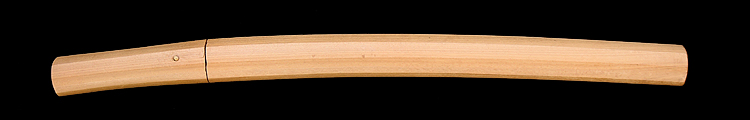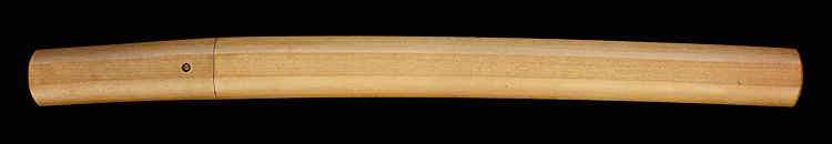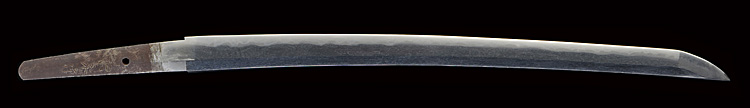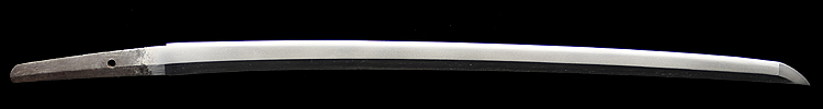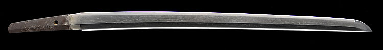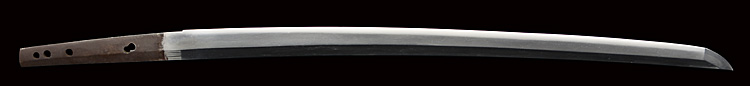 平造り庵棟 うぶ茎 板目肌、杢交じりよく練れ詰む。地沸つき、細かな地景顕われ白気映り立つ。刃紋は細直刃、浅く湾れて小乱れ交じる。匂い口締まり心に小沸よくつく。刃縁ほつれ僅かに小足、葉働く。僅かに金筋、砂流しかかり明るく冴える。末関、室町末期。(保存刀剣)
