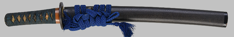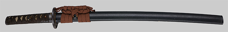 菖蒲造り庵棟 うぶ茎 板目肌、柾交じりややザングリと肌立ちよく詰む。地沸微塵に厚くつき、細かな地景よく入り、淡く白気映り立つ。刃紋は細直刃、浅く湾れて小乱れ交じる。匂い口フックラと小沸よくつく。刃縁よくほつれ二重刃かかり僅かに小足、葉働く。金筋、砂流しかかり匂い口明るく冴える。表裏に棒樋、樋内表に素剣、裏に香箸を浮彫。左安吉の門流。長州瀬戸崎住人。二代目。左衛門尉。黒亀甲塗鞘脇差拵付き。(特別保存刀剣)