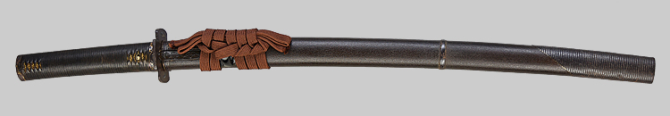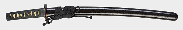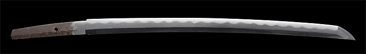 平造り庵棟 うぶ茎 板目肌、杢交じりよく練れ詰む。地沸つき、細かな地景顕われ白気映り立つ。刃紋は細直刃、浅く湾れて小乱れ交じる。匂い口締まり心に小沸よくつく。刃縁ほつれ僅かに小足、葉働く。僅かに金筋、砂流しかかり明るく冴える。末関、室町末期。(保存刀剣)